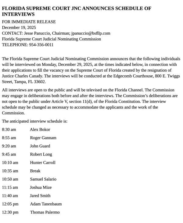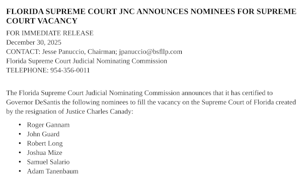 On December 29, 2025 - VolusiaExposed.Com attended, and video recorded, the vetting & interview process of Florida's Supreme Court Judicial Nominating Commission (JNC). The JNC was tasked with interviewing and vetting ten (10) judicial applicants (see right of page =>) to fill an opening on the Florida Supreme Court created by the resignation of Justice Charles Canady. Upon the completion of the vetting, interview, and deliberation processes - the JNC forwarded six (6) judicial nominees to Governor Ron DeSantis for his consideration in making the appointment. (see below right of page =>) This publication has also provided the video interviews and written applications of all six (6) selected nominees (see bottom of page). We wish to thank the JNC members, with particular thanks going out to JNC Chair, Jesse Panuccio for his assistance and cooperation in providing us with the requested information and records. Should our readers wish to express their thoughts to the governor - regarding this pending judicial appointment, please feel free to do so at this email link (jason.weida@eog.myflorida.com) Stand by to stand by ..... we shall post the governor's appointment once he makes it. |