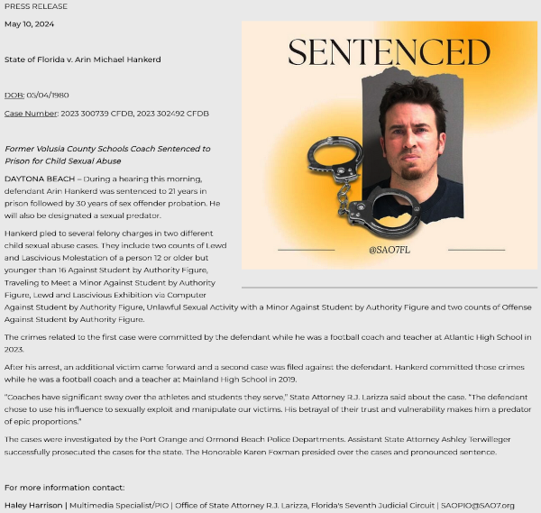 While Ms. Peterson was merely labeled in the FDLE tracking system as a "sexual offender" - Mr. Hankerd was labeled a much higher designation as a "sexual predator". Judge Karen Foxman sentenced Mr. Hankerd to twenty-one (21) years in prison - followed by thirty (30) years of sexual offender probation. May 10, 2024 Former Volusia County teacher sentenced to 21 years in prison for sexual relationships with students We highly suspect that the deciding factor in Ms. Peterson's light sentence, and follow-up sentence reductions were simply related to her family's affluence? Do you imagine that Judge Foxman would ever consider modifying Mr. Hankerd's sentence - especially, if the victims were against these sentence modifications? |