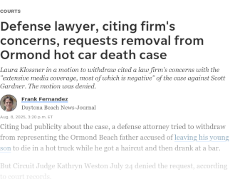 Between The Peterson Law Firm & The State Attorney Office? Because of the earlier mentioned "family" connections between the Peterson law firm and the State Attorney Office (SAO), this publication forwards the position that there - at the very least - appear to be a professional conflict of interest between the law firm and the SAO. Regardless, if this conflict of interest is not being exploited by the parties - they have the responsibility to even avoid the appearance of this conflict. In the recent unrelated prosecutions of two women charged in a dog mauling death - the SAO requested, and received the governor's reassignment of these prosecutions to another prosecutor's office - simply to avoid the appearance of a conflict of interest. Only one of the defendants is related to someone within the SAO's office - but BOTH prosecutions were transferred to another SAO office. Further - in yet another unrelated prosecution - after a conflict of interest was declared by both the local public defender's office, and the Office of Conflict Counsel - local Circuit Judge Kathryn Weston assigned the Peterson law firm to defend Mr. Scott Gardner. Mr. Gardner is charged with the hot car death of his eighteen month old son. This publication assigns no nefarious intentions by Judge Weston - apparently the Peterson law firm were simply next on the list of private law firms willing to accept such cases. |
