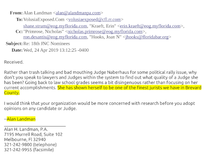 On the same date of our article (April 24, 2019)Mr. Landman wrote this publication a critical email letter - stating that we were "trashing talking and bad mouthing Judge Naberhaus". Mr. Landman goes on to state that "she (Naberhaus) has shown herself to be one of the finest jurists we have in Brevard County".