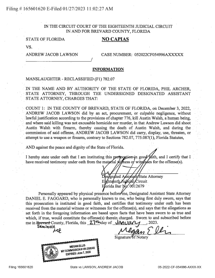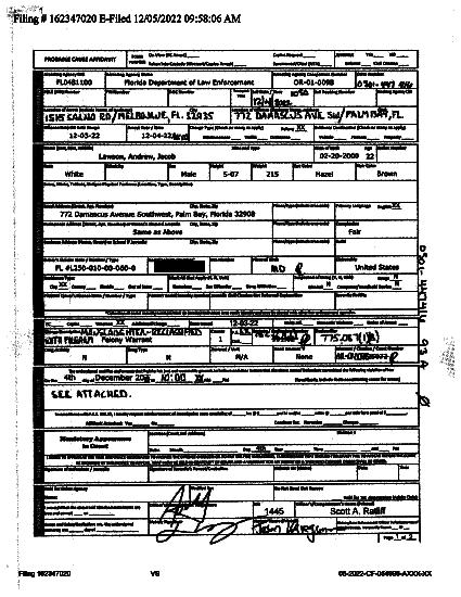 According to their filed Probable Cause Affidavit, within thirty (30) hours of the shooting, FDLE arrested Lawson under a second degree felony charge of manslaughter. Within the month - and after heavy media attention, the local prosecutor's office would raise that to a first degree felony manslaughter charge(see both charging affidavits @ right of page =>).