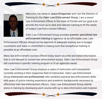Since Kriegsman currently has a "senior investigative" position within the Seventh State Attorney's Office (SAO) - this publication is left to wonder - does the SAO OR any law enforcement agency within the Seventh Judicial Circuit maintain any training contracts with the Valor Group? AND, if so - are those contracts "conflicts of interest" against the administration of justice?